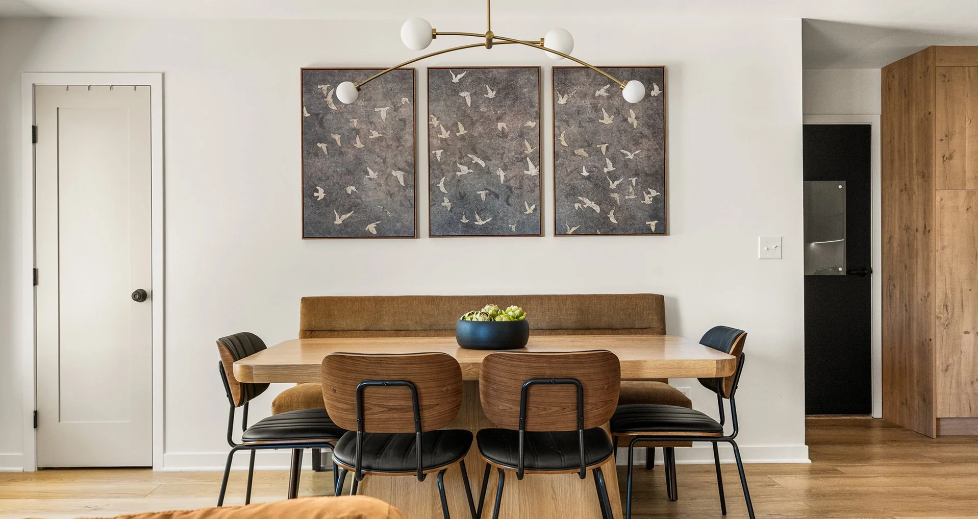 Elegant luxury interior design of sun-filled dining room with rectangular oak table, black chairs and bench, spiky pendant fixture, and partitioned photo wall display.